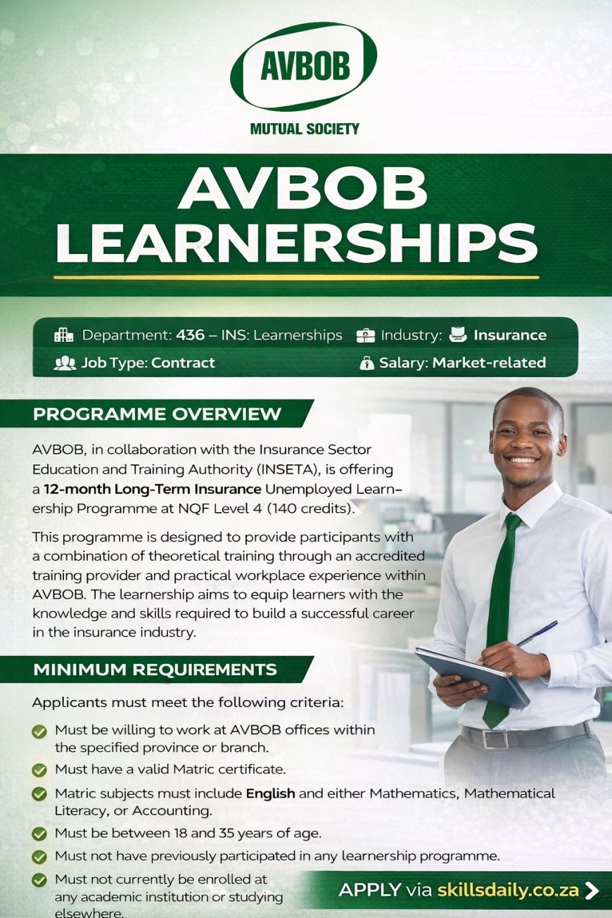In South Africa’s evolving job market, learnership programmes have become an important pathway for young people seeking practical work experience and industry-relevant skills. Among the organisations contributing significantly to youth development is AVBOB Mutual Assurance Society, a well-established company in the funeral and insurance sector. Through its learnership initiatives, AVBOB offers unemployed youth the opportunity to gain qualifications, workplace exposure, and valuable professional skills.