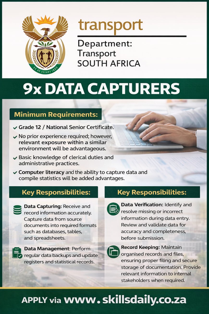 Within the Department of Transport, data capturers are responsible for collecting, recording, verifying, and maintaining essential transport-related information. Their work supports multiple units, including: