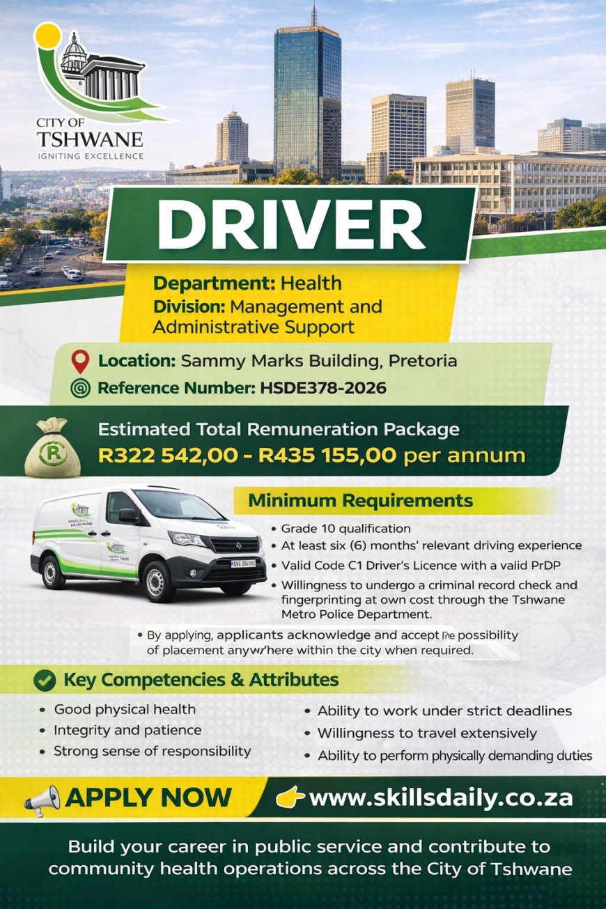 Applicants must be willing to be deployed to any location within the City of Tshwane as determined by departmental management