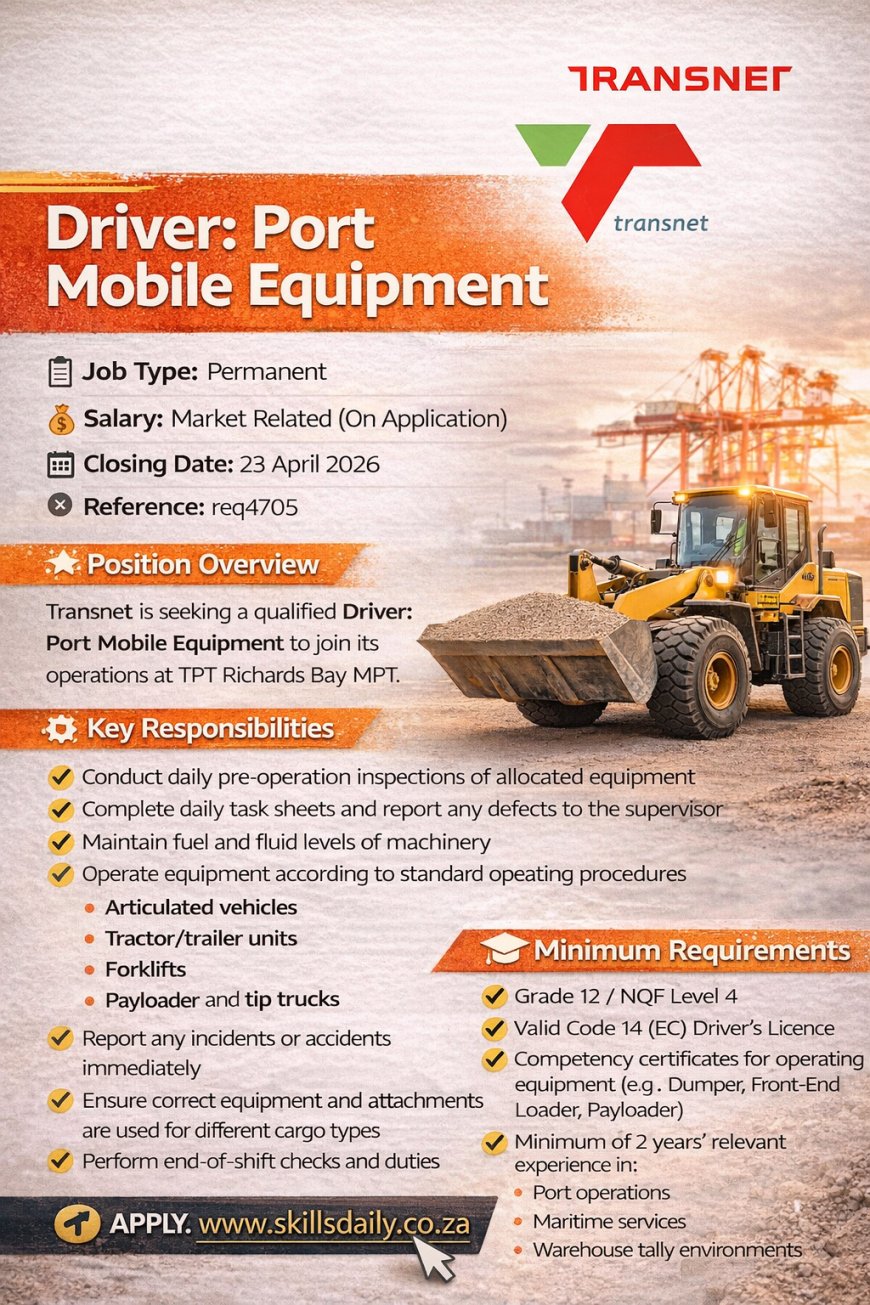 Transnet is seeking a qualified Driver: Port Mobile Equipment to join its operations at TPT Richards Bay MPT.