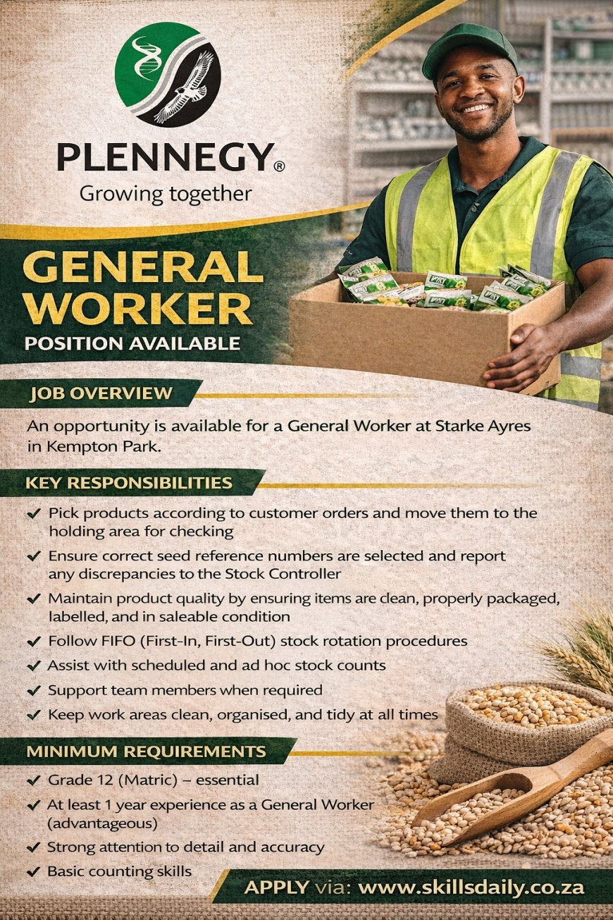 An opportunity is available for a General Worker at Starke Ayres in Kempton Park. The successful candidate will be responsible for picking, packing, and handling stock while ensuring quality standards and operational efficiency are maintained.