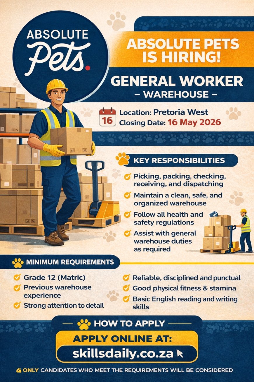 Absolute Pets is looking for a dependable and hardworking General Worker to support daily warehouse operations.