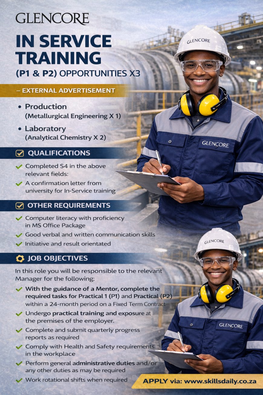 Global mining company Glencore has opened three (3) In-Service Training (P1 & P2) opportunities for students seeking practical workplace experience as part of their tertiary studies. These opportunities are aimed at students studying Metallurgical Engineering and Analytical Chemistry, providing them with valuable industry exposure in one of the world’s leading mining and commodities companies.