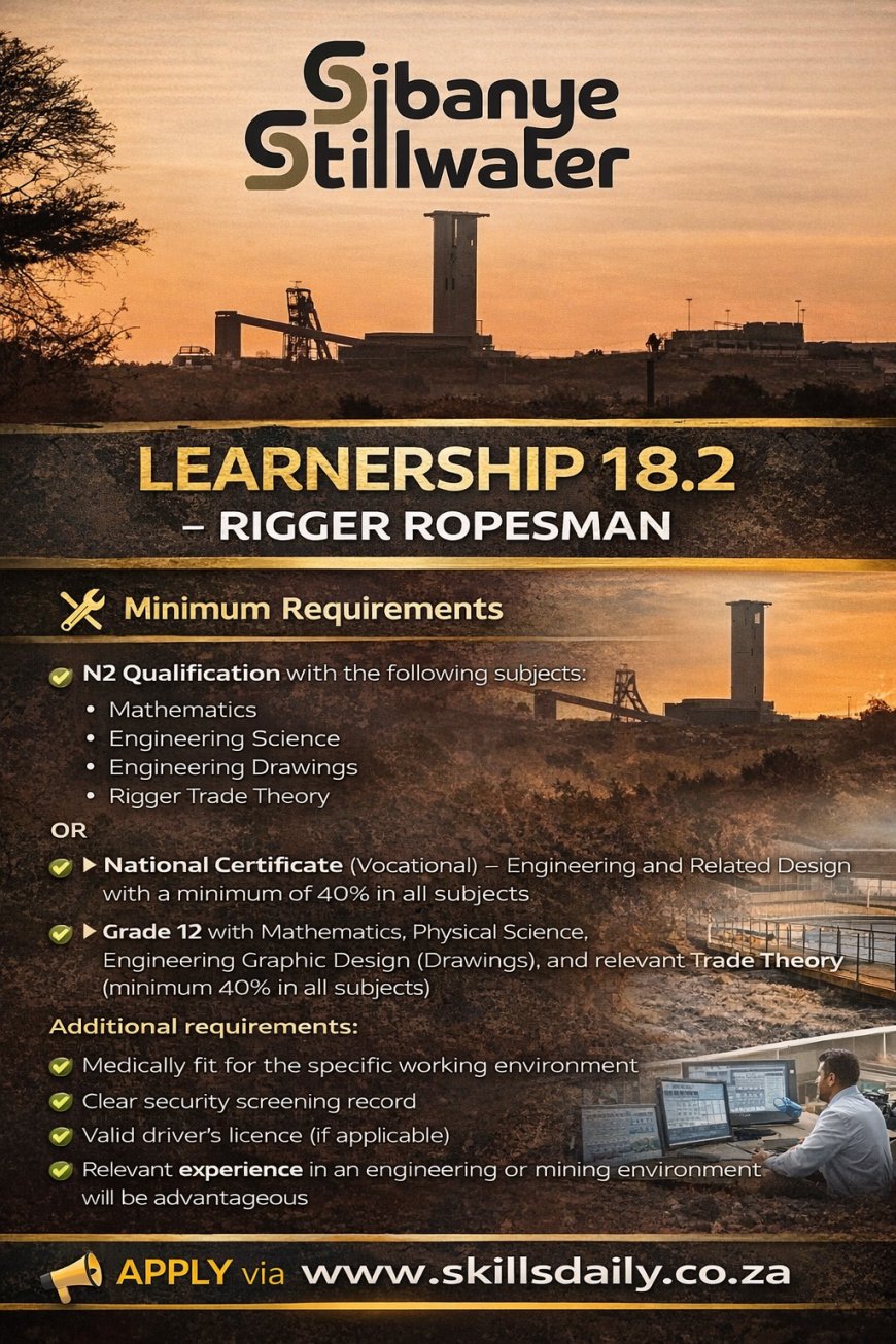 An opportunity is available for a Learnership 18.2 Rigger Ropesman within the Platinum Marikana operating segment. This programme is designed to provide structured training and workplace exposure aligned to engineering and rigging standards within the mining environment.