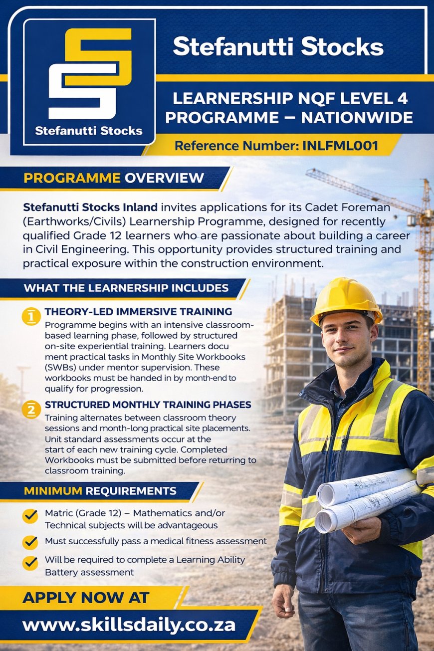 Stefanutti Stocks Inland invites applications for its Cadet Foreman (Earthworks/Civils) Learnership Programme, designed for recently qualified Grade 12 learners who are passionate about building a career in Civil Engineering. This opportunity provides structured training and practical exposure within the construction environment.