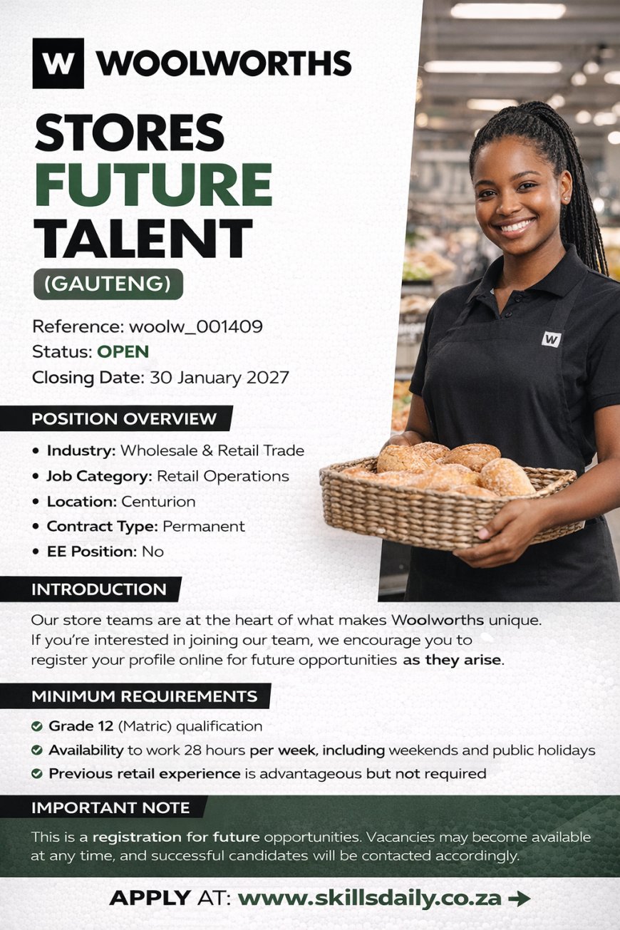 The purpose of this role is to represent the Woolworths brand by delivering engaging and memorable customer experiences. Responsibilities include operating tills and ensuring the store is well-presented, organised, and visually appealing at all times.
