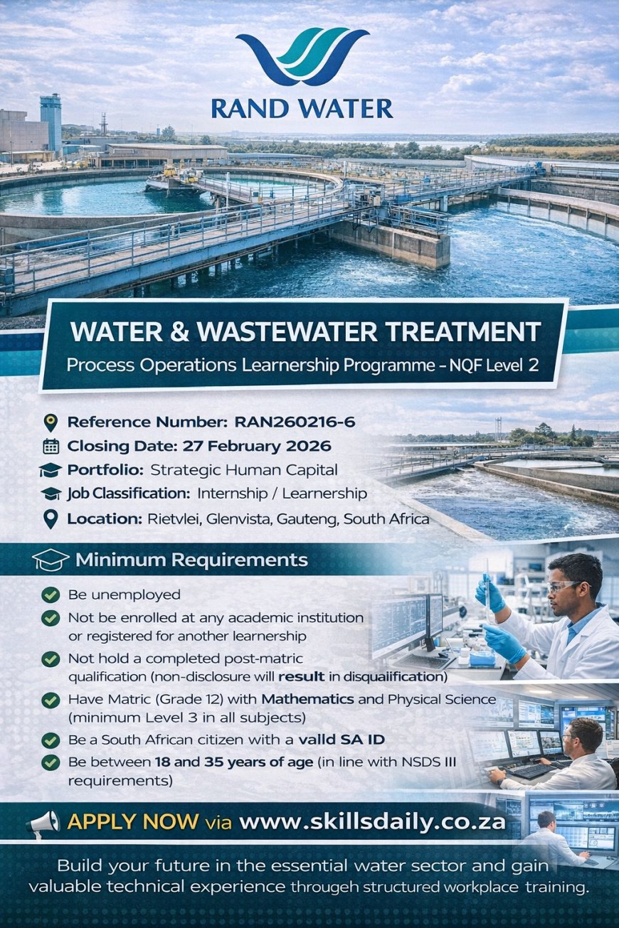 In support of employment creation and the development of scarce and critical skills aligned to the National Skills Development Strategy III (NSDS III), Rand Water invites applications for its Water and Wastewater Treatment Process Operations Learnership Programme (NQF Level 2).